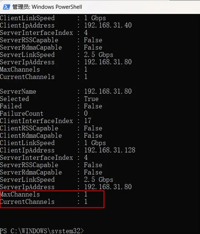Get-SmbMultichannelConnection |fl,假如Maxchannels和CurentChannels这两列数据相同,例如我这显示1、1,则表示电脑端Samba多通道连接情况是生效的。那么接下来,就让我们来体验翻倍起飞的Samba区网传输速度吧!