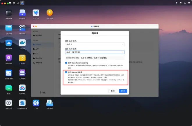 而现在只要绿联云客户端打开“网络服务-Samba-高级设置”,然后勾选“启用Samba多通道”,接着重新启动Samba开关,一般就“握手成功”了。