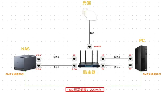第四种情况,如果你电脑还是配的两个千兆口,那么DX4600的两个2.5G网口都连接到2.5G交换机上,此时电脑的Samba传输速度还是只有220+m/s。