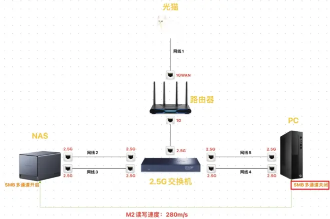 一般来讲,目前市面上的大多数2.5G路由器一般只有一个2.5G网口,所以用2.5G网口将NAS和路由器相连之后,那么路由器就没有空余的2.5G网口连接到电脑/笔记本上,那么就无法享受到局域网内单2.5G网口最高280m/s的文件传输体验。