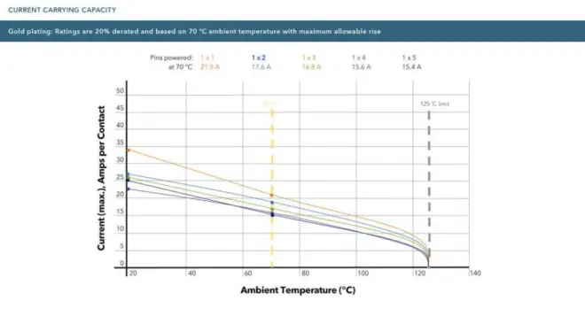 出于这个原因,了解产生多少热量是很重要的。与许多连接器制造商一样,Samtec会公布载流能力图表,特别是我们的电源连接器。 下面是一个例子,取自mPOWER®系列的电源连接器。该图表显示了在特定环境温度下触点的最大额定功率。