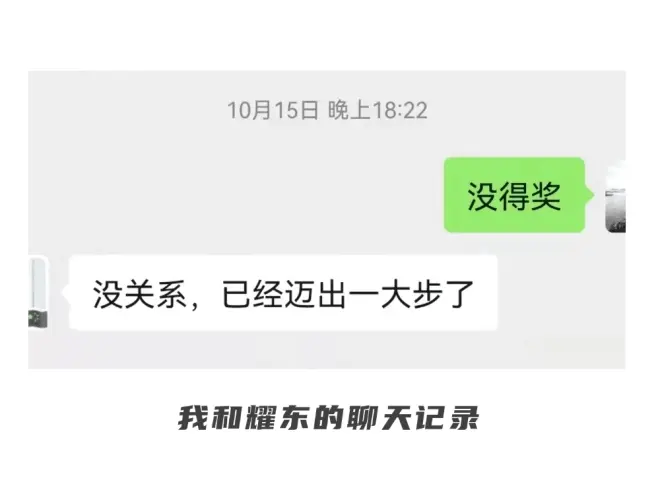 崔说完立刻跑回候场区去做准备。我一溜烟跑向秀场,在拥挤的拍摄区找到一个角落观看最后的颁奖流程。20:41,拍到崔在台上领奖的那一刻,我抑制不住起死回生的情绪,给耀东、父亲、好友大魁微信改口又发了两个字: