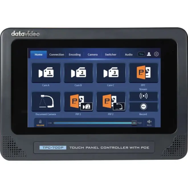 Datavideo洋铭设计的混合教学直播录播方案ZR-1,是面向广大教育单位和企事业单位的教学或培训使用场景,在直播或是录播的过程中仅需一个工作人员就能在操作端通过一个7寸面板完成摄像控制及导切、录像和直播的控制,甚至当前端摄像机无需做参数和运动控制时,讲师自己都能做简单的画面导切,一键录像直播等操作控制,非常简单。而且控制面板采用触控设计,快捷的触控交互给现代人如同使用平板的熟悉感,倍感轻松。