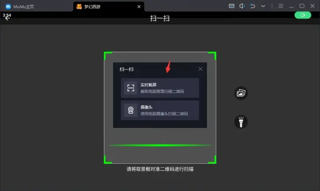 第一步,在MuMu模拟器应用商店内下载安装《梦幻西游》手游,启动游戏后点击游戏界面右侧的扫码,授予权限后再点击实时截屏;