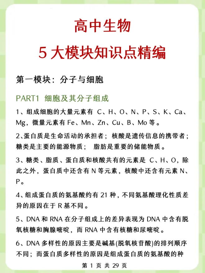 对于很多同学来说,生物是比较好入门的科目,今天分享的生物知识,对高中生物的内容分为了五个板块,并进行了精编汇总,尤其适合准备升入高三的同学们学习收藏哦!
