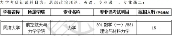 同 济 大 学 19 58 年 正 式 设 立 力 学 专 业 , 围 绕 核 工 程 、 土 木 工 程 等 开 展 人 才 培 养 和 科 学 研 究 。 进 入 21 世 纪 , 同 济 大 学 为 适 应 中 国 航 空 航 天 事 业 迅 速 发 展 以 及 上 海 将 航 空 航 天 作 为 支 柱 产 业 之 一 的 需 求 ,以 原 上 海 航 空 工 业 学 校 划 归 同 济 大 学 管 理 为 契 机 , 在 原 工 程 力 学 与 技 术 系 的 基 础 上 , 发 挥 学 校 学 科 交 叉 、 人 才 集 聚 的 综 合 优 势 , 于 200 4 年 1 月 成 立 了 航 空 航 天 与 力 学 学 院 。 那 么 , 同 济 大 学 力 学 专 业 院 校 考 研 都 考 什 么 科 目 , 招 生 人 数 这 么 样 呢 ? 继 续 往 下 看
