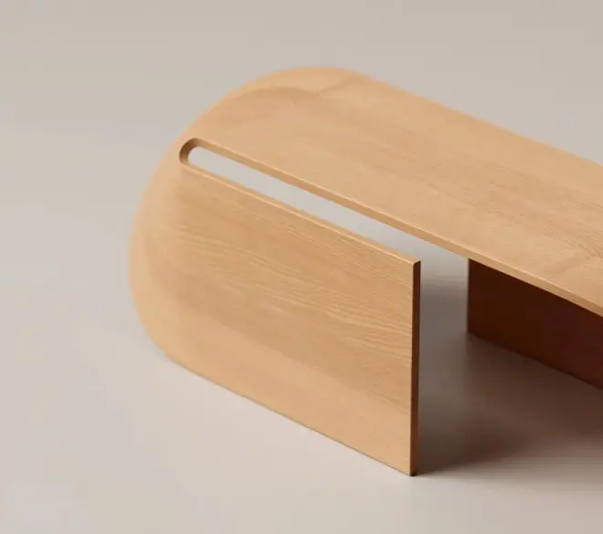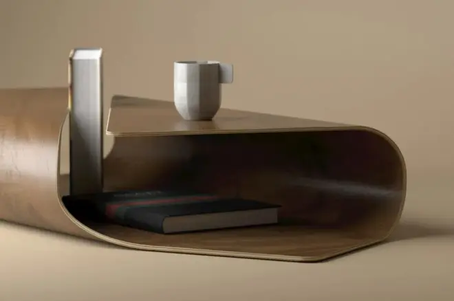 Cocoon咖啡桌以独特的造型兼顾了实用与美观。本质上,它只是一个平坦的木制平面,两个相对的边缘被抬起和弯曲,几乎相遇,形成一个提升的表面,充当桌面。这两个边缘之间的间隙则成为一个独特的书槽,而下方的空间可以用来存放小物件或其他阅读材料。