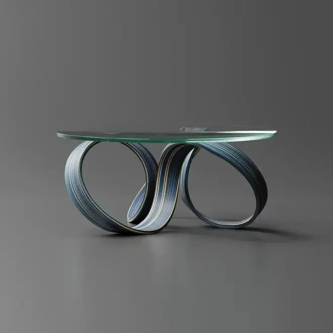 这种设计是通过弯曲一个螺旋连接其起点和终点而创建的。这样,您就可以得到一个非常具有雕塑感的形状,但也非常实用,可以作为坚固的底座支撑桌面。选择玻璃作为桌面,以便始终看到美丽的、雕塑般的弯曲螺旋。