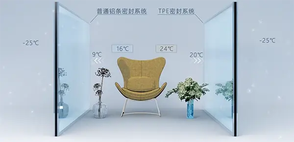 TPE玻璃是一种配备了热塑性暖边材料,防起雾、防自爆、防渗水、防漏气的玻璃。其自带的TPE热塑性间隔条,内部不含任何金属嵌入物减少了中空玻璃边部的冷、热传导系数,使中空玻璃整体更为平均的温度分布,有效降低了凝露的产生;再则TPE优良的力学性能和剥离强度保证了正负压下的边缘密封性能。