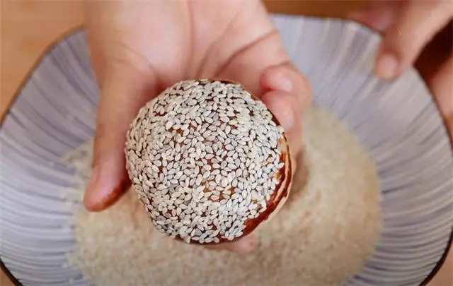 11.然后再蘸上一层白芝麻,我们这个剂子就做好了。