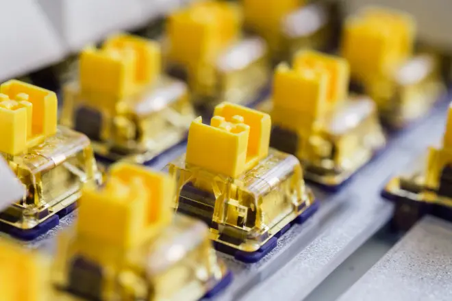 说完了外观,我们再来看看性能的内部配置。达尔优现在主要使用的轴体有紫金轴、天空轴,其中紫金轴是段落轴,这款轴体触发力度为45g左右,行程为2.1mm,整体是一款类茶轴的段落轴。按压时有压力感,要比线性轴更容易感知,因为我之前都是使用线性轴,很少使用段落轴,这款紫金轴可以感受到段落轴的那种按压的手感,但是声音却接近于线性轴,很有意思。值得一提的是紫金轴太好看了。