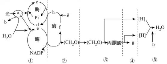 下面是某植物叶肉细胞中光合作用和呼吸作用的物质变化示意简图,其中①~⑤为生理过程,a~h为物质名称,请回答: