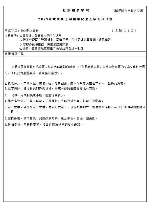 1、室内景观、城市建筑、工业:完成改良方案,包括三视图(平面、立面、剖面图)2、视觉传达和数字媒体:可从数字化产品概念、概念海报、UI、信息图表、利益相关图、用户体验旅程图等方面完成一个概念方案。3、动画:结合功能与体验,完成相关故事版。4、纺织品设计:提取标志性元素,以插画的形式完成装饰场景图。5、设计管理、奢侈品设计管理、生活方式设计:以文字为主的策划案形式,如有必要可附以相关图表,不少于1500字的主题分析。6、其他专业:无特殊要求,结合自己所报专业的表现。