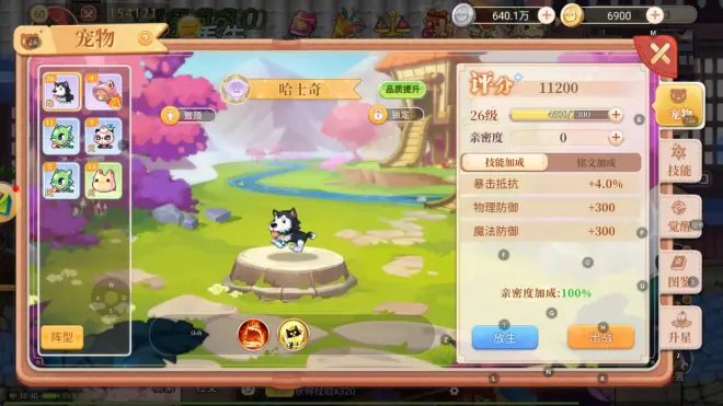 等级和亲密度呢就不多说了,只能通过资源升,有资源的话就往出战的宠物身上砸。技能方面,大家最好和小编一样首选技能是攻击力,但要看清楚,如果你是法师技能就别学物理攻击,如果你是战士,技能就别学法术攻击,学了会浪费技能栏,大家慎重考虑。比如小编玩的战士的话,首选攻击力,次选暴击率和暴击伤害,再然后是防御和血量,如果还有技能栏,剩下的有什么学什么。