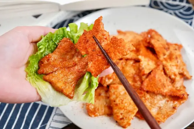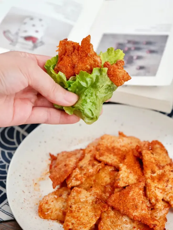 肉片简单腌制下,再用平底锅一煎就行,吃起来香嫩不油腻。包上生菜,完全就是烤肉那味儿。
