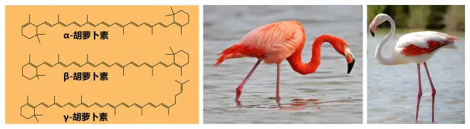 类胡萝卜素(carotenoids)是一类具有线性共轭结构的分子,能够吸收从紫外到绿色短波长光谱范围内的光线,外观呈现黄、橙、红色。由于动物体内缺乏蕃茄红素合成酶,因而这类色素并非由动物自身直接合成,往往通过摄食或共生关系获取。进入体内的类胡萝卜素经代谢后,最终会沉积在鸟类的羽毛、喙和皮肤中。此外,不同类型的类胡萝卜素混合还可以产生中间色调。我们在火烈鸟身上看到的粉色、橙色、红色正是由上述过程产生,其源头则来自火烈鸟所食用的甲壳类和藻类等微小生物。倘若火烈鸟的食物中缺少类胡萝卜素,那么它们的羽毛将逐渐变为灰白色。因而在自然界中,类胡萝卜素所赋予的颜色深浅可以为动物间的性选择提供有关饮食和健康状况的信号。