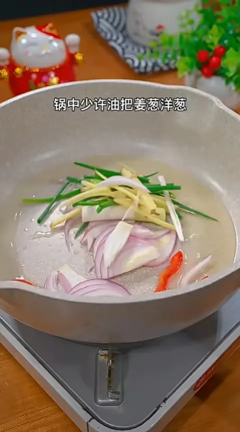 4.锅中少许油把姜葱洋葱煸炒出香味,加100g清水,50g蒸鱼豉油一点白糖,煮两分钟,捞出沥渣渣