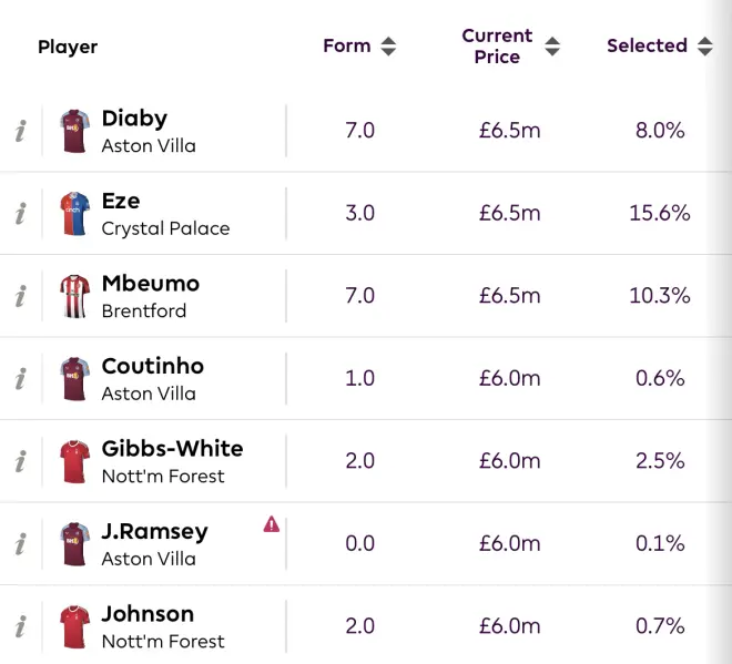 现有资金空间(6.5)+1个转会名额前提下,可做的选择有:布伦特福德的姆贝乌莫(6.5),水晶宫的埃泽(6.5),阿斯顿维拉的迪亚比(6.5),诺丁汉森林的约翰逊(6.0)。
