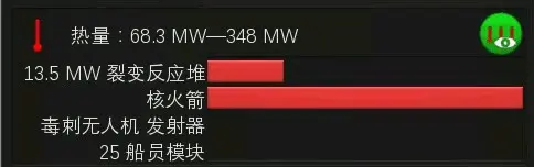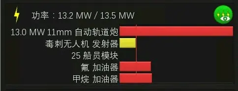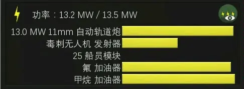 武器: 3× 60× 小(100 MW)耀斑 爆炸发射器 2× 6.50MW 毒刺无人机 发射器 🌡1× 2×1 碳化硅 散热器 1× 25× 毒刺无人机 4× 13.0 MW 11mm 自动轨道炮(45°,备弹100000×4) 3× 13.0 MW 11mm 自动轨道炮(60°,备弹100000×3) 发电机: 1× 13.5 MW 热电偶裂变反应堆 🌡4× 10×5 碳化硅 散热器 🌡4× 10×5 碳化硅 散热器 指挥: 2× 25 船员模块 🌡1× 6×5 铝 散热器 船员:48/50 行政部门:7 舰长×1 大副×1 文书军士×1 后勤官员×2 厨师×1 医生×1