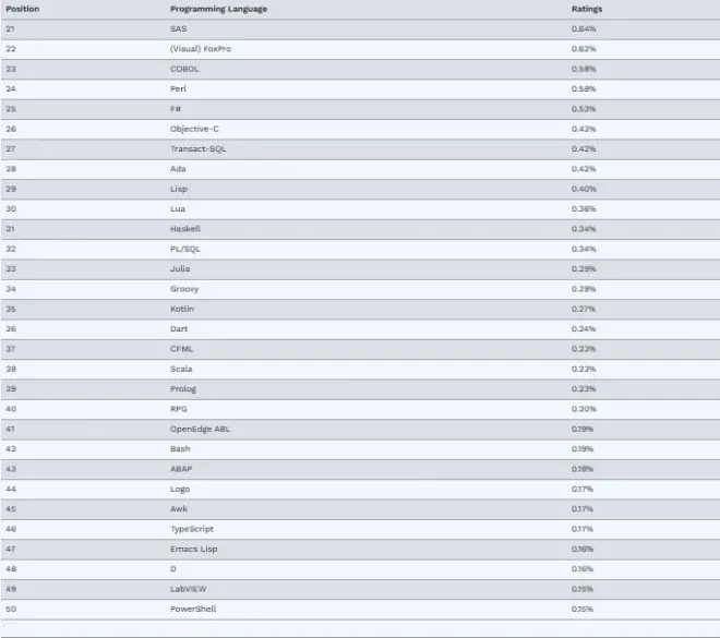 在保持了三个月的第三名之后,C++再次被Java反超,排在了第四位,而上个月排在第11位的Go这次以1.24%的占比冲进了前十。