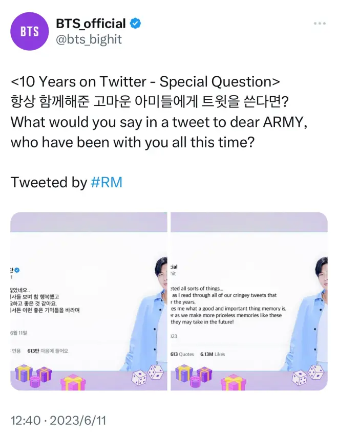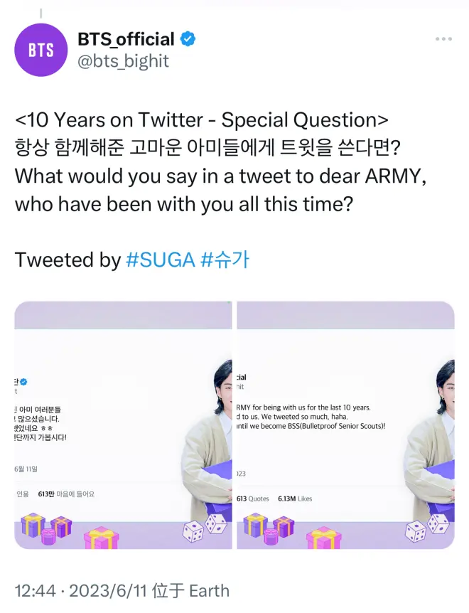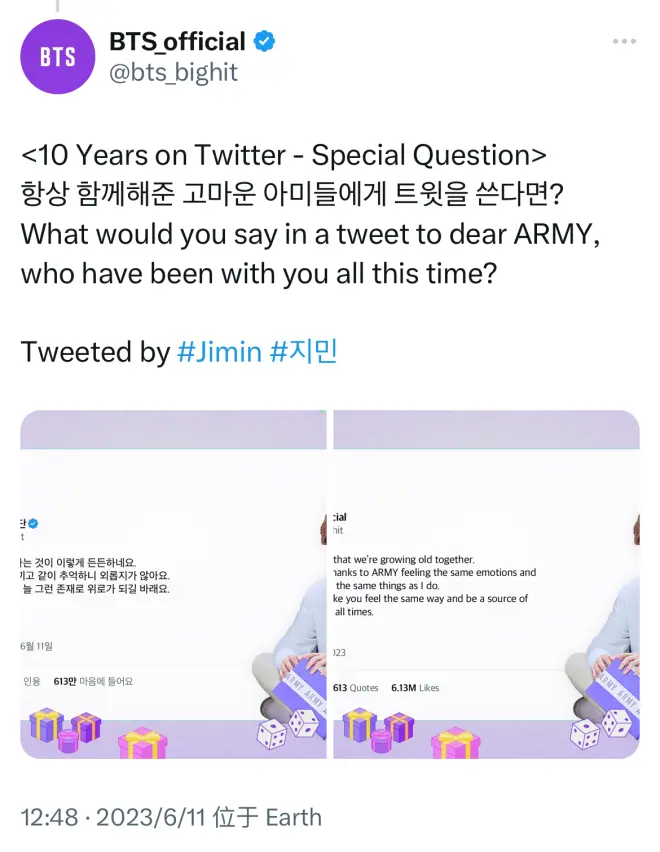 What would you say in a tweet to dear ARMY, who have been with you all this time?