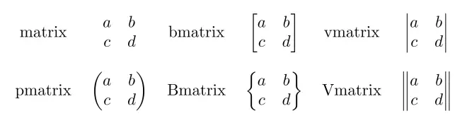 主要的矩阵环境有下面几种。他们的区别主要是矩阵的括号不同,基本语法没有本质区别。