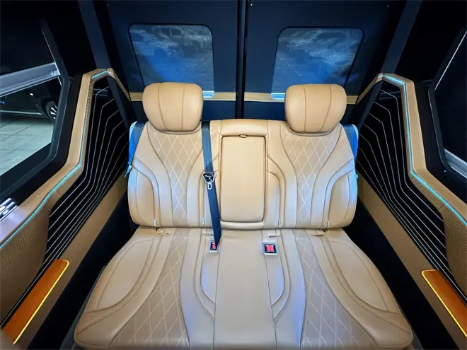 后方布局,即为两个航空座椅加一个沙发大床的布局。豪华舒适的中排座椅,带通风加热按摩,旋转腿托的所有功能,皮质柔软又舒适,乘坐的舒适感达到最佳效果。后排的沙发床180度的平躺,日常的出行累了困了,车上可有一个平躺的地方,休息一下很好。