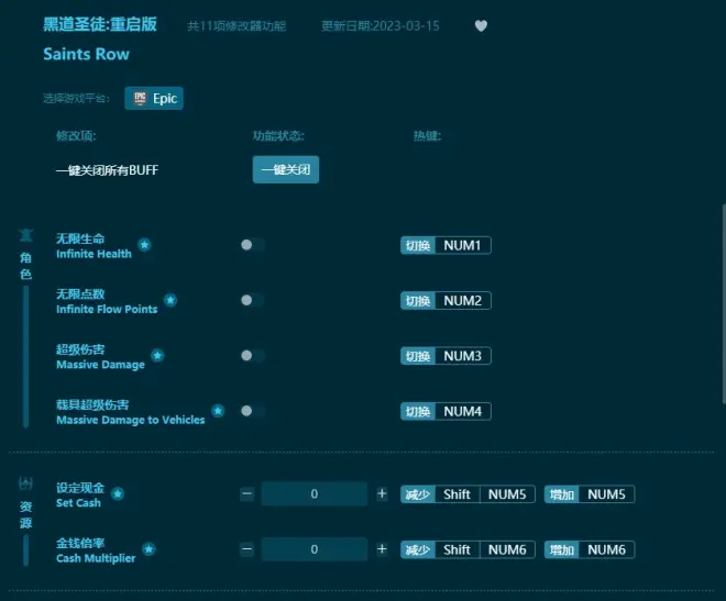黑道圣徒:重启版修改器11项内容及热键: