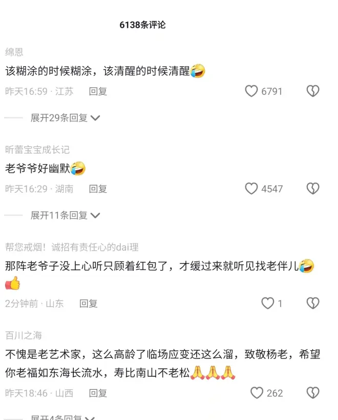 而且看评论区大家都在祝福杨少华老先生身体健康,足见大家不反感这种“老男人好色”的梗,只要杨少华能开开心心的,哪怕真的再找个年轻小老伴儿,也无伤大雅嘛!