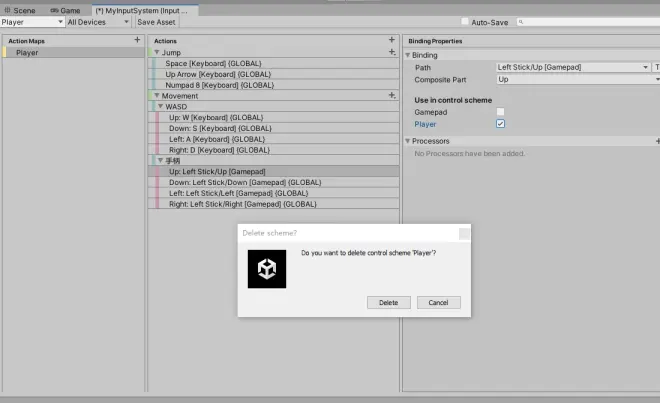 删除Control Schemes的时候要注意,切换到自定义Schemes,选择删除后, 首先会询问是否确定删除。选择确定后会弹出,是否删除所有勾选为指定Schemes的Binding,以当前为项目例,如果选择“yes”,所有勾选"Player"的Binding都会被删除,如果选择“No”则Binding会被保留只删除Control Schemes。
