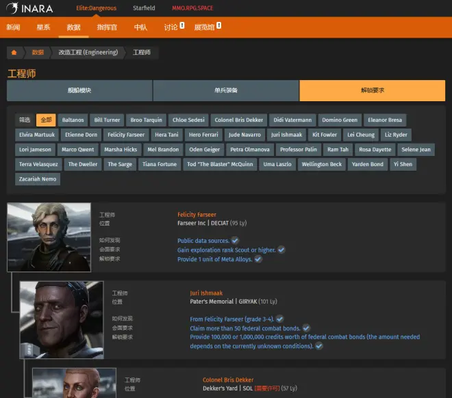 递进路径可参见工程师页面的 解锁要求 面板,新版 Inara 总体可能不如旧版 Inara 直观。