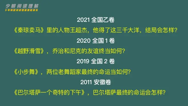 在这四个问题后,再追问一句“根据小说内容,谈谈你的看法”,这简直就是对阅读理解的终 极考核了。