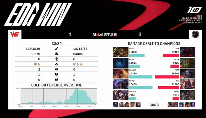 结果开局五分钟,第二局的背锅者阿乐就打出了一血,而后EDG随即起势,利用峡谷先锋连破WE上路两塔,随后持续运营扩大经济优势。中期领先后的EDG,在斩获大龙后,没有再犯第二局的毛病。30分30秒,EDG不算太难的赢下比赛。