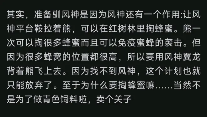 (来看小熊,升级的时候摆手手敲可耐~) 这是我第一次抓熊,熊的攻击还挺高的,而且熊也可以采集纤维(其实大地懒也可以),但熊不能采集树木获得木头和茅草(这点大地懒可以)。不过,熊和大地懒采纤维的时候都会顺手采一身果子,这点就比不过采草丛的时候只出纤维没有副产物的镰刀龙了 骑着熊的时候会获得一个蜜蜂防护效果。这样再去掏蜂蜜就不会被蜜蜂蛰啦。而且熊一次能掏出更多的蜂蜜 所以熊掏蜂蜜的数量跟熊的等级有关系吗?好像都是固定15个吧 所以我为什么要驯一个这么高级的…… (方舟里的熊叫“恐熊”,不过我在网上好像查不到恐熊,查“恐熊”这个名字出来的直接就是方舟的相关内容了) (既然方舟是个古生物游戏,那以大众知名度来看,这只恐熊有可能是洞熊或者短面熊) (另外,我感觉方舟有些动物的设计像是现代生物的效果披了古生物的皮——比如说方舟想要有老鹰,于是有了阿根廷巨鹰;方舟想要有狼,于是有了恐狼;方舟想要有熊,于是有了恐熊)