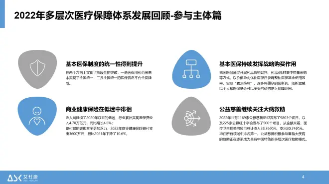 在21世纪的今天,医疗保障体系已经成为衡量一个国家社会发展水平的重要指标。医疗保障体系不仅关乎每一个公民的健康和生活质量,也关乎社会的公平和稳定。站在当下回望2022年,尽管经受了新冠疫情的冲击,政府继续坚持以人民为中心的发展思想,以满足人民日益增长的健康需求为目标,推进医疗保障体系的建设,我国的多层次医疗保障体系建设仍然取得了重要的突破。