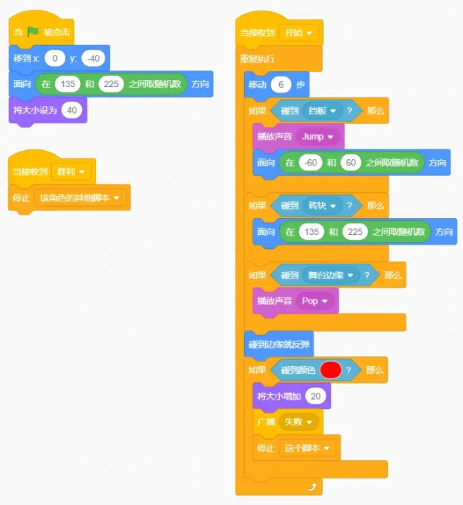 【任务2】游戏开始之后,不断前行,如果碰到挡板,向上选择一个随机方向弹起;如果碰到砖块,向下选择一个随机反向落下来;如果碰到舞台边缘直接反弹;如果碰到舞台最下边的红线,广播“失败”。