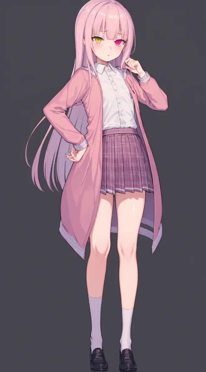 1girl,lilith,heterochromia,pink_hair,long_hair,coat,shirt,pleated_skirt,flat_chest,solo,standing,hand on hip,socks,underwear,white background,simple background,(masterpiece),((best quality)),(ultra-detailed),((an extremely delicate and beautiful)),