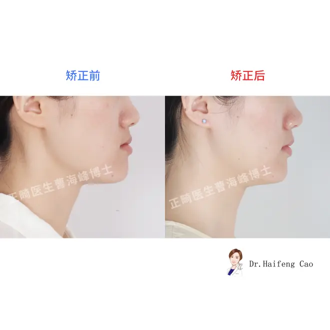 28岁女生,主诉:“地包天”矫正前,上颌后缩,下颌前突,骨性“地包天”(有遗传史),正面不对称,关节伴有弹响,咬合不佳影响饮食和发音。