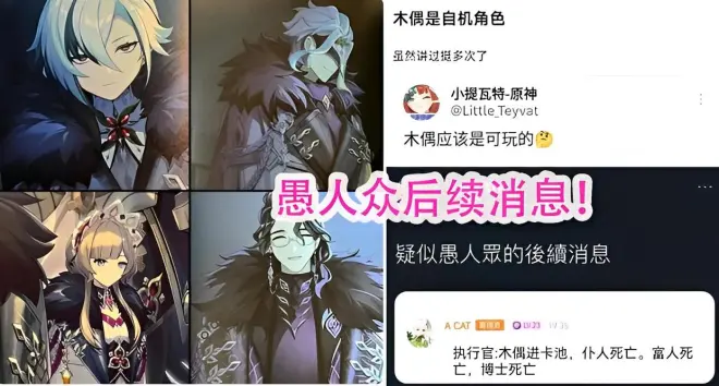 当然除了仆人会死于枫丹以外,还有舅舅们爆料木偶是自机角色,应该是会进卡池的,而除了木偶进卡池,仆人、富人、博士最终都会死亡,消息来源的话大家自辩哈,不过仆人大概率是无了,结局不太好。