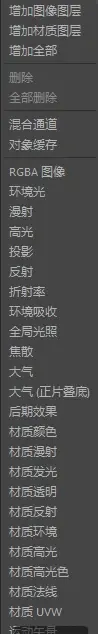 多通道特别多,漫射、高光、反射、折射、全局光照、环境吸收等等。先选择然后再保存合成方案,再后期调整,可以让渲染结果上好几个档次。