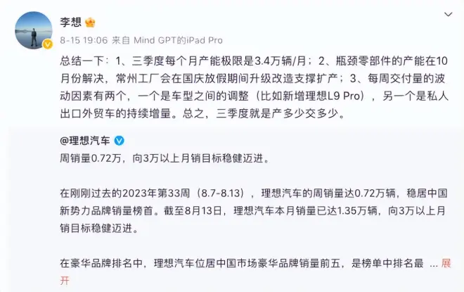 而目前影响理想汽车销量因素的还有一个就是产能限制,根据此前李想对外言论表示,理想今年三季度每个月产能极限是3.4万辆;瓶颈零部件的产能在10月份解决,常州工厂会在国庆放假期间升级改造支撑扩产。而三季度整体是产多少交多少的情况。