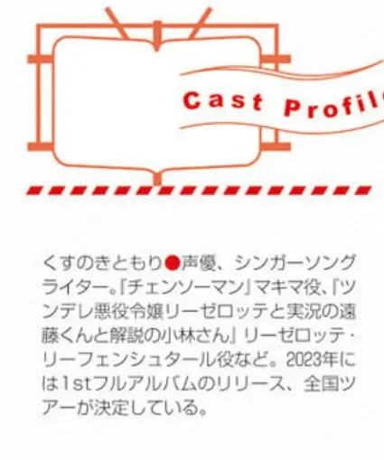 楠木灯 声优、创作型歌手。【电锯人】饰演玛奇玛,【傲娇反派千金莉洁洛特与实况主远藤同学及解说员小林同学】饰演莉洁洛特·里芬修坦 等等。2023年发售1st专辑,全国演唱会巡演也已决定。