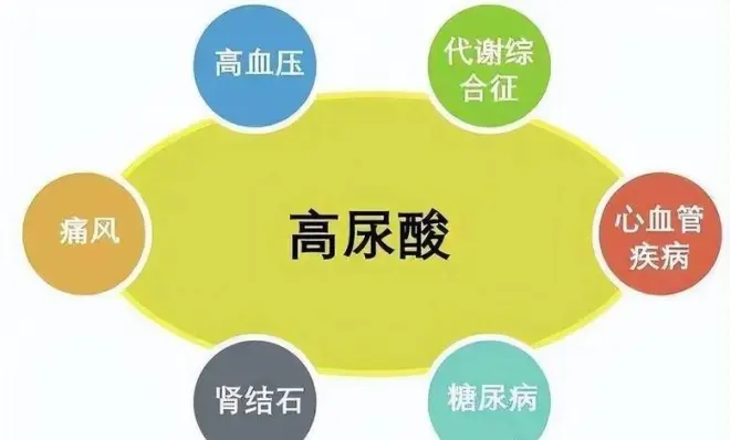 痛风的前身——高尿酸血症。在高尿酸血症期是并无明显特征的。高尿酸血症也不一 定会发展成痛风,但是痛风一 定伴随着高尿酸血症。正常成人男性的血尿酸水平应 该在420μmol/L以下,虽说各医院因仪器和试剂的原因而会导致数据不一样,但是相差值不会偏差太大。由于尿酸是嘌呤代谢的产物,正常情况下,人体会将尿酸通过肾脏排出体外。然而,当体内尿酸的产生过多或者肾脏无法有效排除尿酸时,就会导致尿酸在血液中的浓度升高,从而出现高尿酸血症。高尿酸血症放任不管,后期就可能会出现一系列的问题,比如说:痛风、高血压、糖尿病、心血管疾病或者肾脏疾病等。所以治疗痛风的最佳时期应该在高尿酸血症状时期,提早的预防和治疗,将尿酸控制在360μmol/L以下,也就不会发展成痛风或其他疾病。