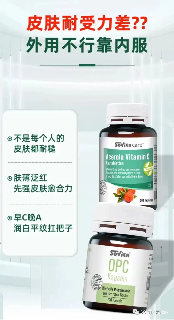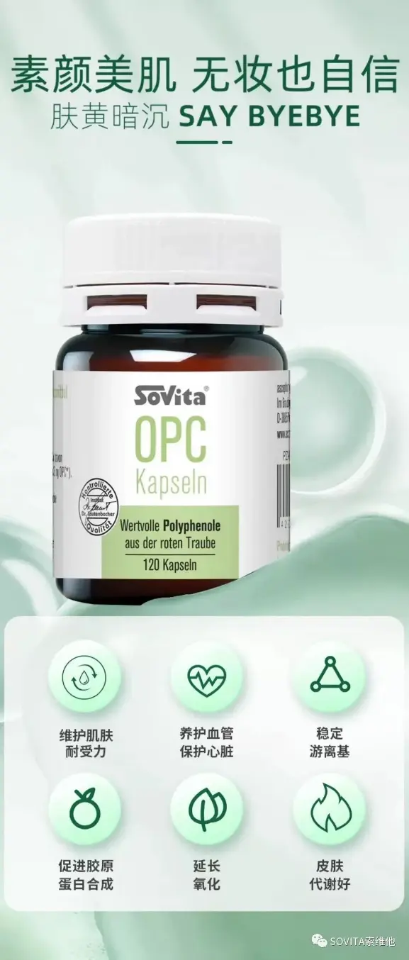 *心血管保护&撑起肌肤保护伞:1、提亮紧致:优质低聚原花青素、改变光老化,养出紧致亮肤;2、保护血管:血管健康弹跳有力;3、皮肤代谢:促成内在胶原蛋白合成;4、轻松吸收:花青素高含量、提升全身循环。