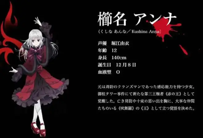 安娜的特殊能力被称为“红色魔法”,她可以通过自身鲜血形成的弹珠直接透视人心,并通过玻璃球确定对方的位置,相当于赤组的测谎仪和定位系统。虽然她只能辨识红色,但这也使她对红色充满热爱,常常穿着深红色的哥特服装。对于安娜来说,周防就是能为她的世界染上色彩的存在。