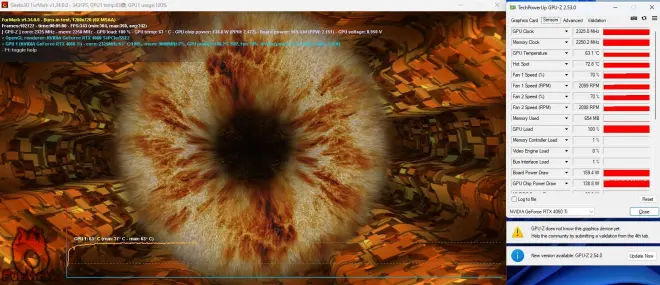 在玻璃面板的情况下,我们来看看显卡和CPU的温度情况,在5分钟Furmark的甜甜圈测试后,显卡温度为63.1℃。