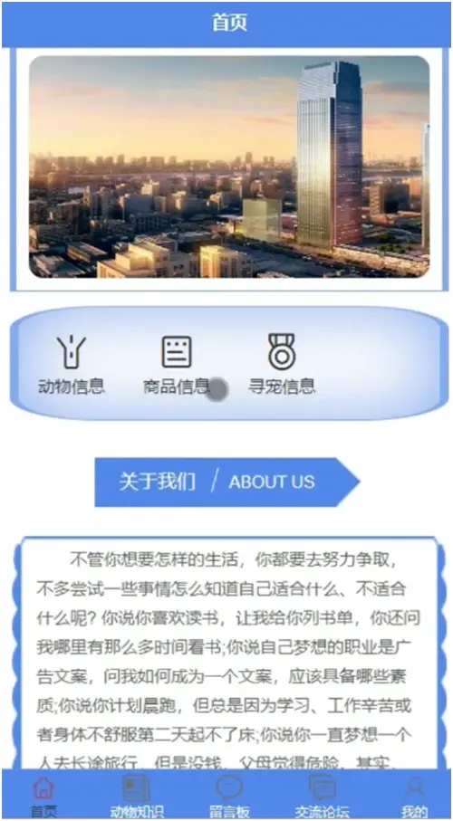 APP首页是用户注册登录后进入的第一个界面,用户可通过APP端首页的最下面的那一行导航栏中的“首页、动物知识、留言板、交流论坛、我的”进入到相应的功能进行操作。如图5-3所示。