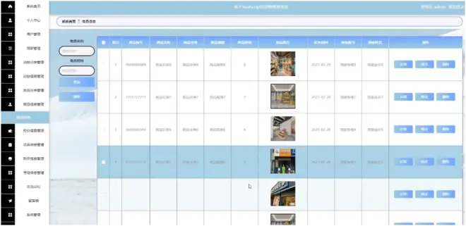 管理员点击商品信息管理;在商品信息管理页面对商品编号、商品名称、商品分类、商品规格、商品价格、商品图片、发布时间、商家账号、商家姓名等信息,进行查询,删除商品信息等操作;如图5-11所示。