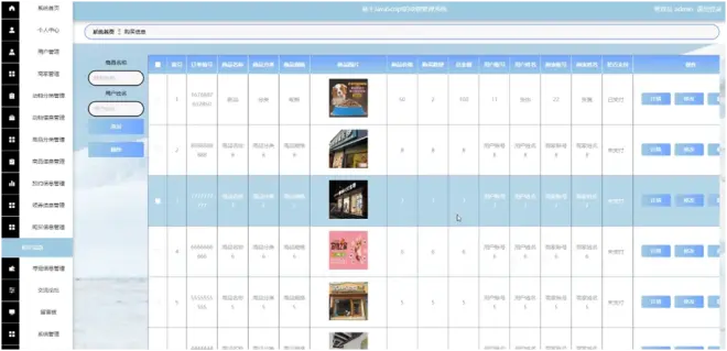 管理员点击购买信息管理;在购买信息管理页面对订单编号、商品名称、商品分类、商品规格、商品图片、商品价格、购买数量、总金额、用户账号、用户姓名、商家账号、商家姓名、是否支付等信息,进行查询,删除购买信息等操作;如图5-12所示。