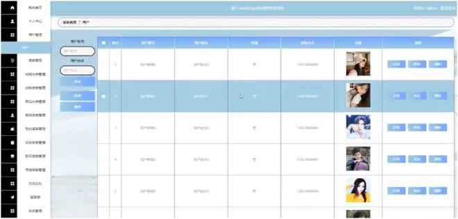 管理员点击用户管理;在用户管理页面对用户账号、用户姓名、性别、联系方式,头像等信息,进行查询,新增或删除用户信息等操作;如图5-8所示。